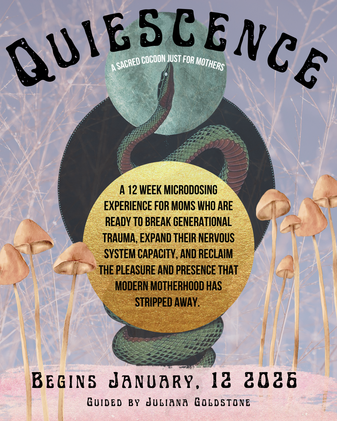 With the support of sacred mushroom medicine, the crystalline stillness of Winter, and a community of other moms walking right alongside you, this is your invitation to: